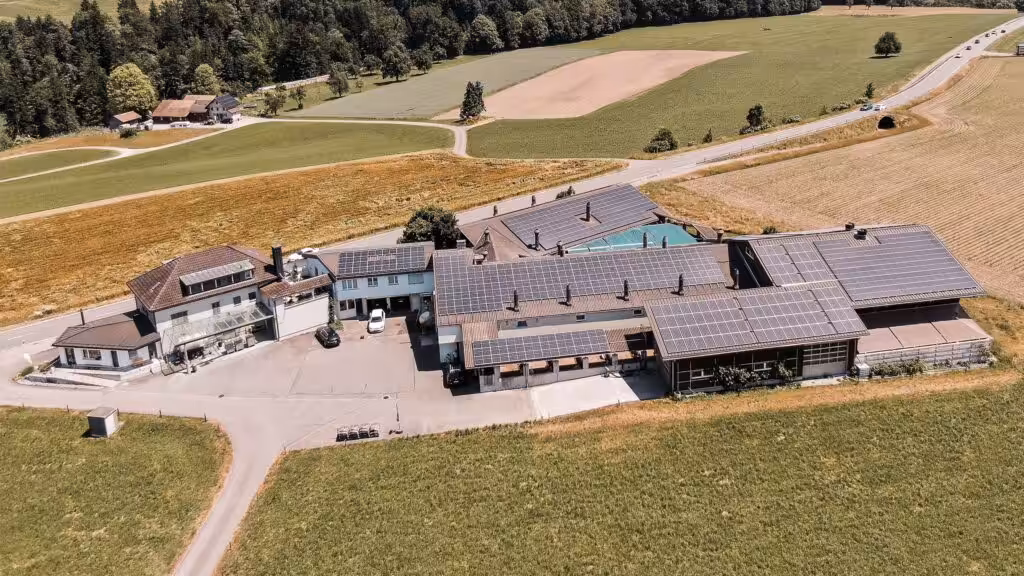 Die Siedlung «Am Aawasser» in Buochs gilt seit 2020 als Musterbeispiel der dezentralen Energieversorgung. Den Strom liefert nicht nur eine Photovoltaikanlage, sondern auch ein eigenes Wasserkraftwerk. Alle Energieerzeuger, -speicher und